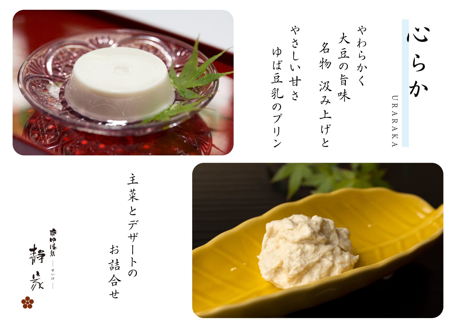 商品名:心らか - Uraraka - 《お召し上がり目安1~3名さま》 静家自慢の 汲み上げゆば と ふんわり上品な甘さの 豆乳プリンのセットです。 汲み上げ一番ゆば は 温かい御飯の上に乗せてワサビ醤油で。生姜やポン酢、めんつゆ以外にもオリーブオイルや味噌・お塩等の組み合わせもおすすめ。 やさしい味わいのゆば豆乳プリン は、器に盛ってそのままでも、あずき・ブルーベリー等のジャムやソース 、黒蜜などを少し乗せても楽しめます。 一番のお気に入りの組み合わせをお探しになってください。