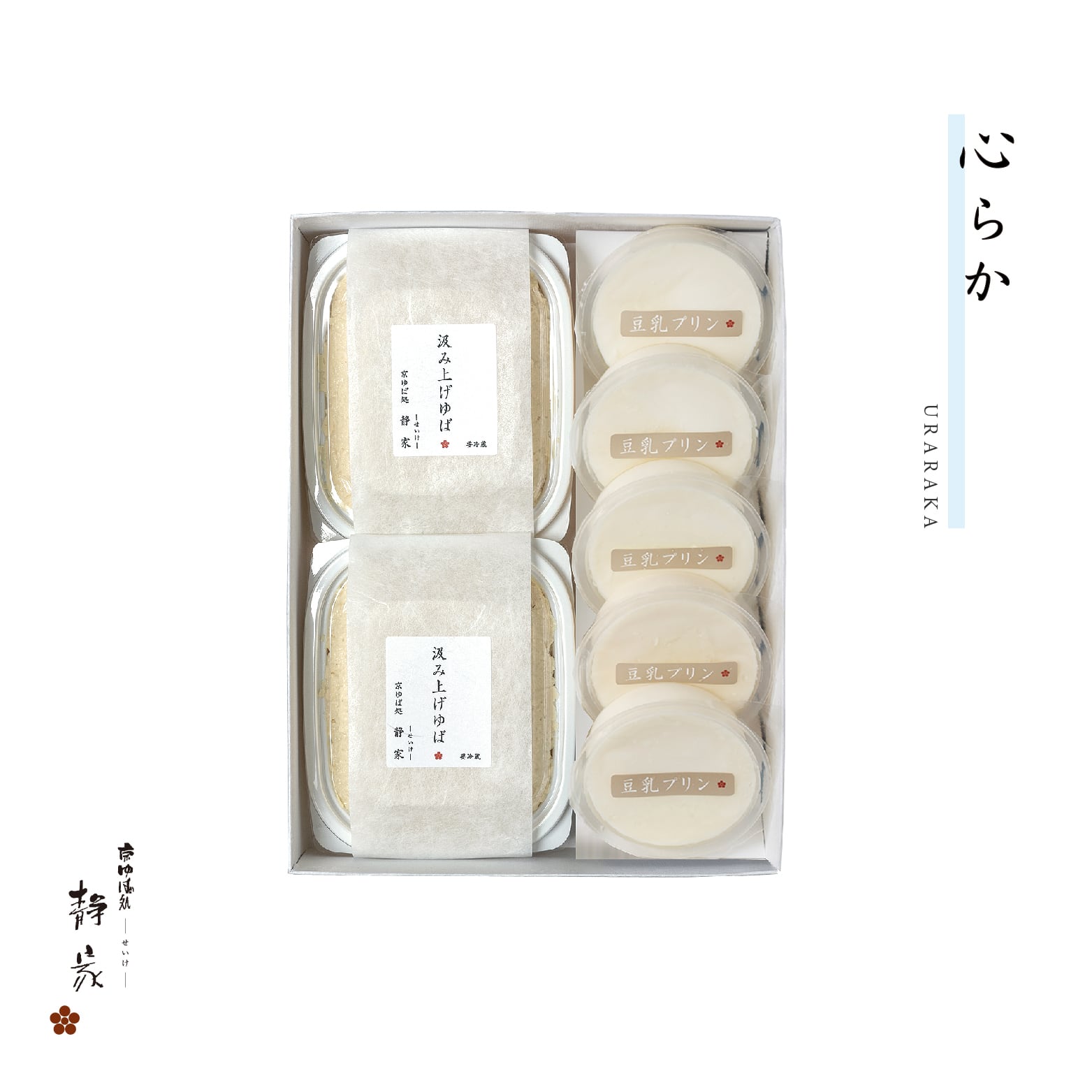 静家自慢の 汲み上げゆば と ふんわり上品な甘さの 豆乳プリンのセットです。