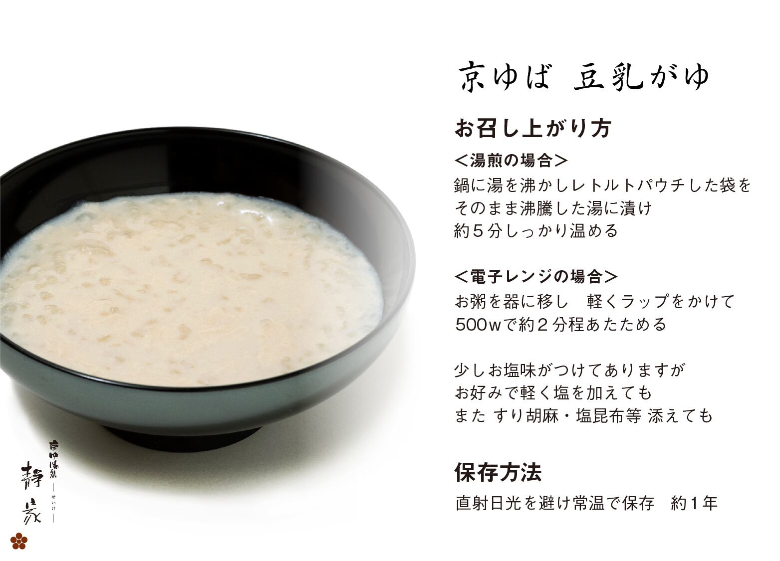 ご自宅でも、手軽に『京ゆば入り 豆乳がゆ』の味わいをお楽しみください。