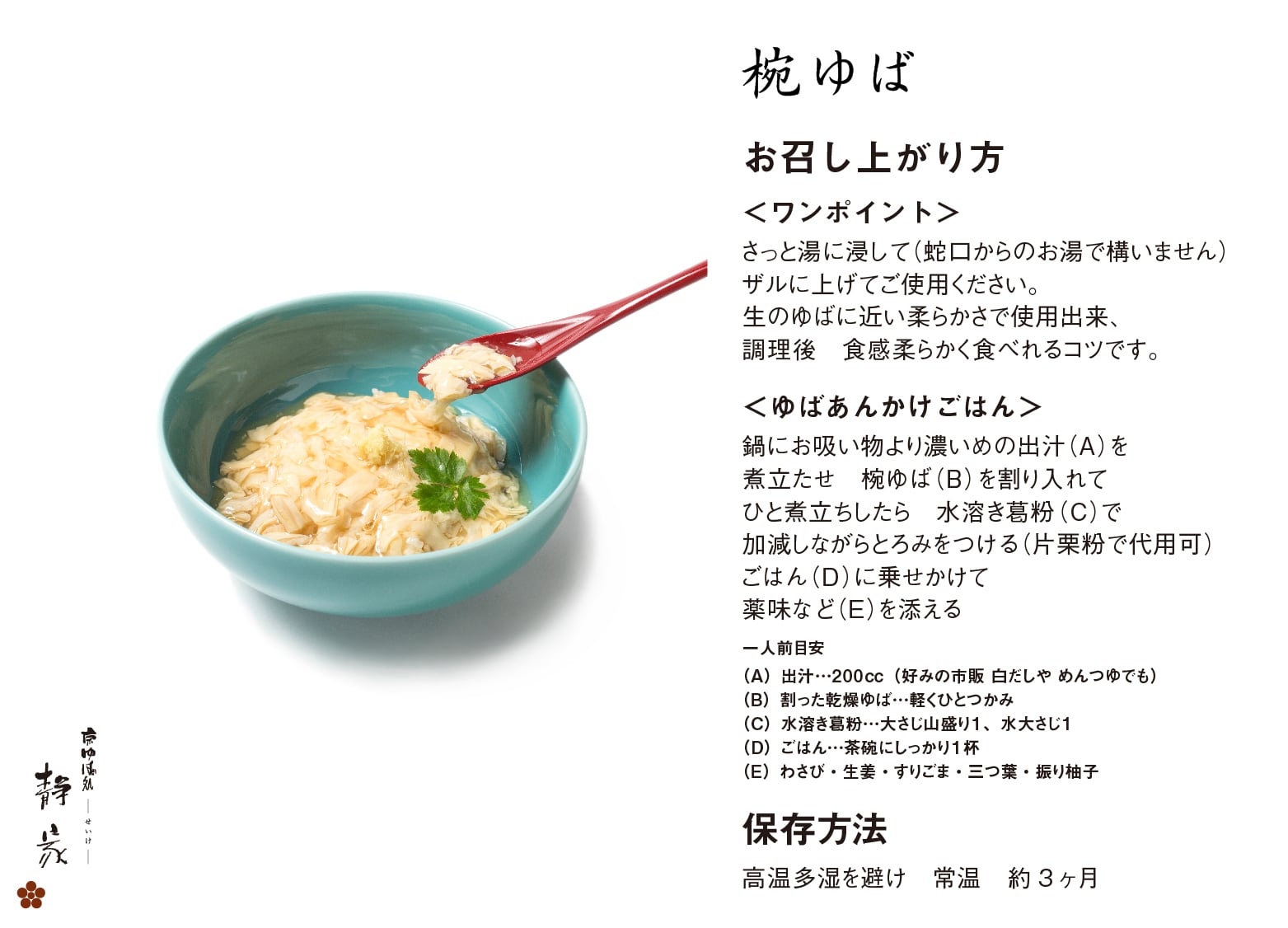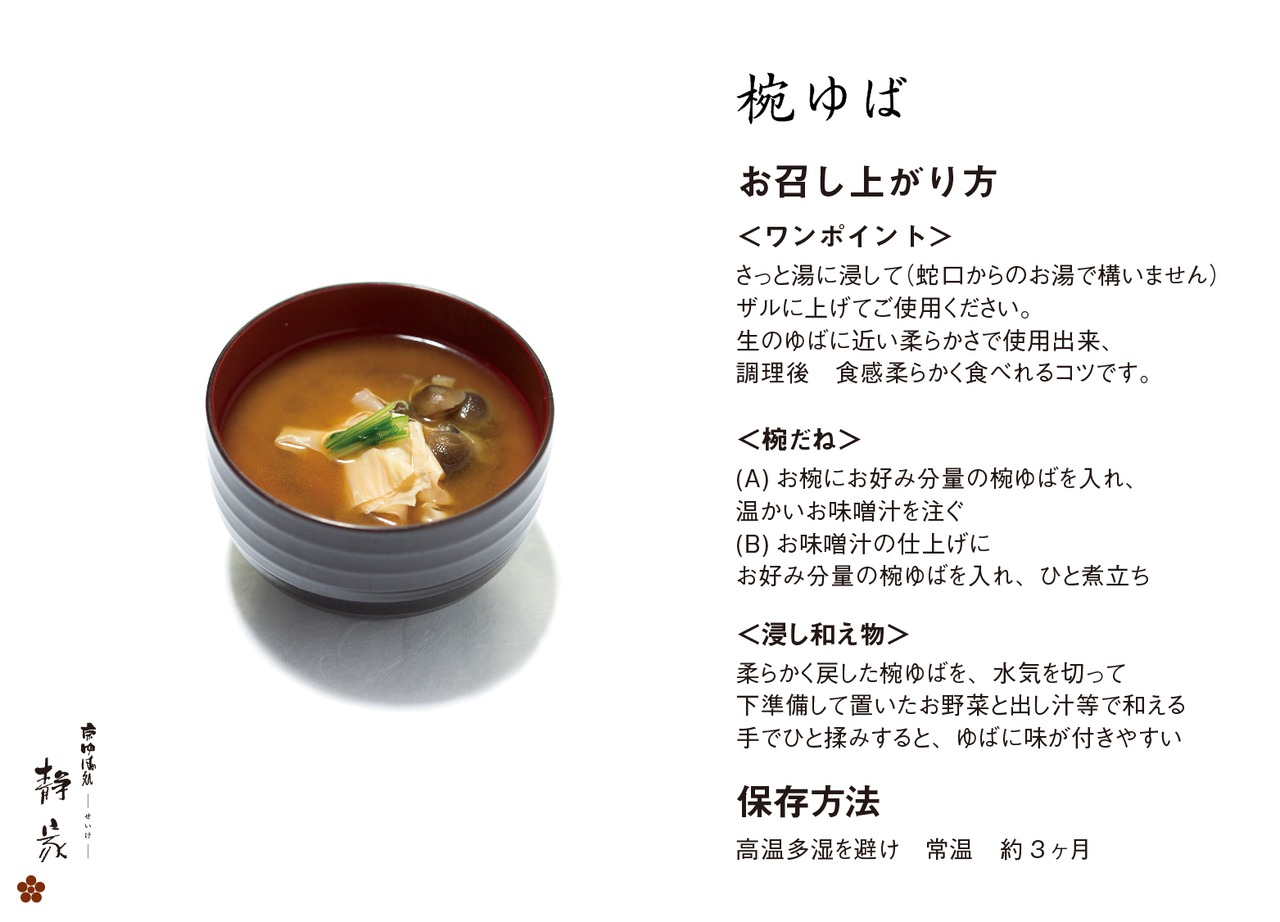椀ゆばは、お湯に1分ほど浸けて柔らかく戻し 水気を切ってから ご利用ください。美味しくお召し上がりいただけます。